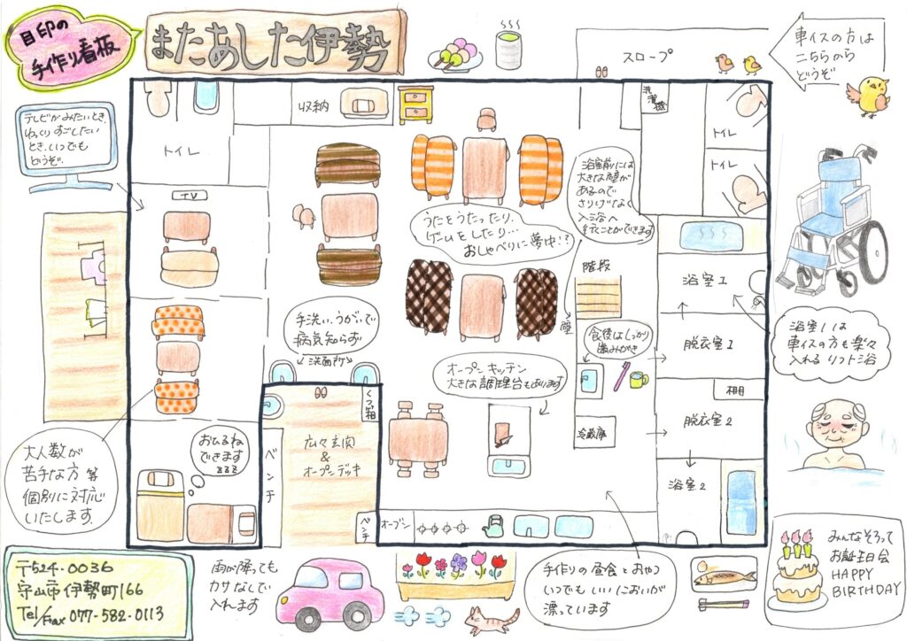 大きな民家を改修したデイサービス。玄関には、利用者様お手製の季節の“のれん”がお出迎え。美しい空をふと見上げると、自然と笑顔がほころぶ・・・そんな優しい場所にしたい。たくさんの人たちの思いがこもる一軒家。